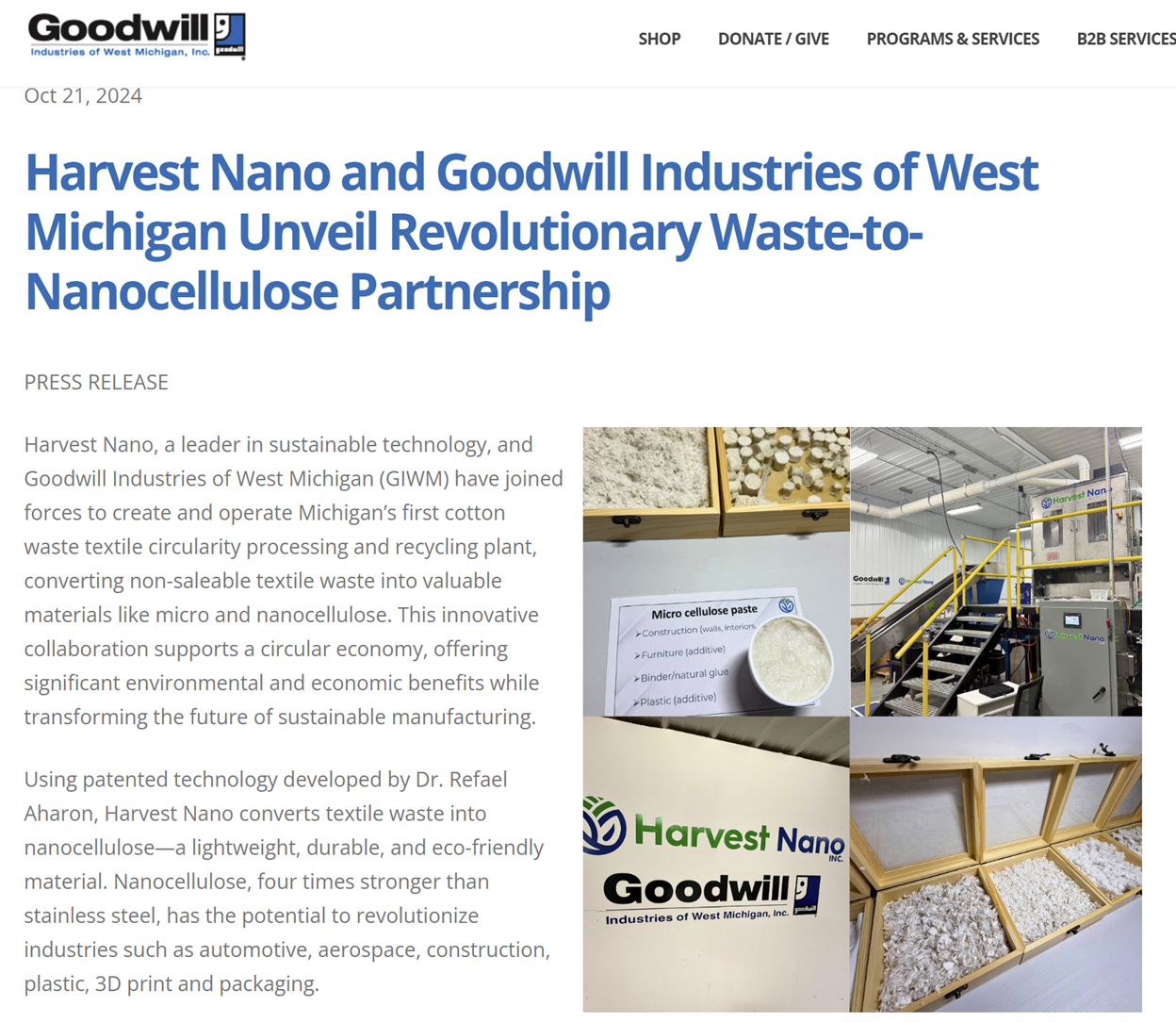 In 2023, Harvest Nano licensed its Textile waste IP/technology to Goodwill Industries of West Michigan to build a textile circularity machine, converting unsellable cotton textiles into higher-value cellulose and nanocellulose products. In October 2024, Goodwill publicly announced our joint effort to create andoperate Michigan’s first cotton waste textile circularity operative processing and recycling plant, turning non-saleable textile waste into cellulosic raw materials and nanocellulose. That milestone matters because the world is producing fiber at record levels, 124 million tons in 2023, while true textile-to-textile recycling remains a small fraction of the system.