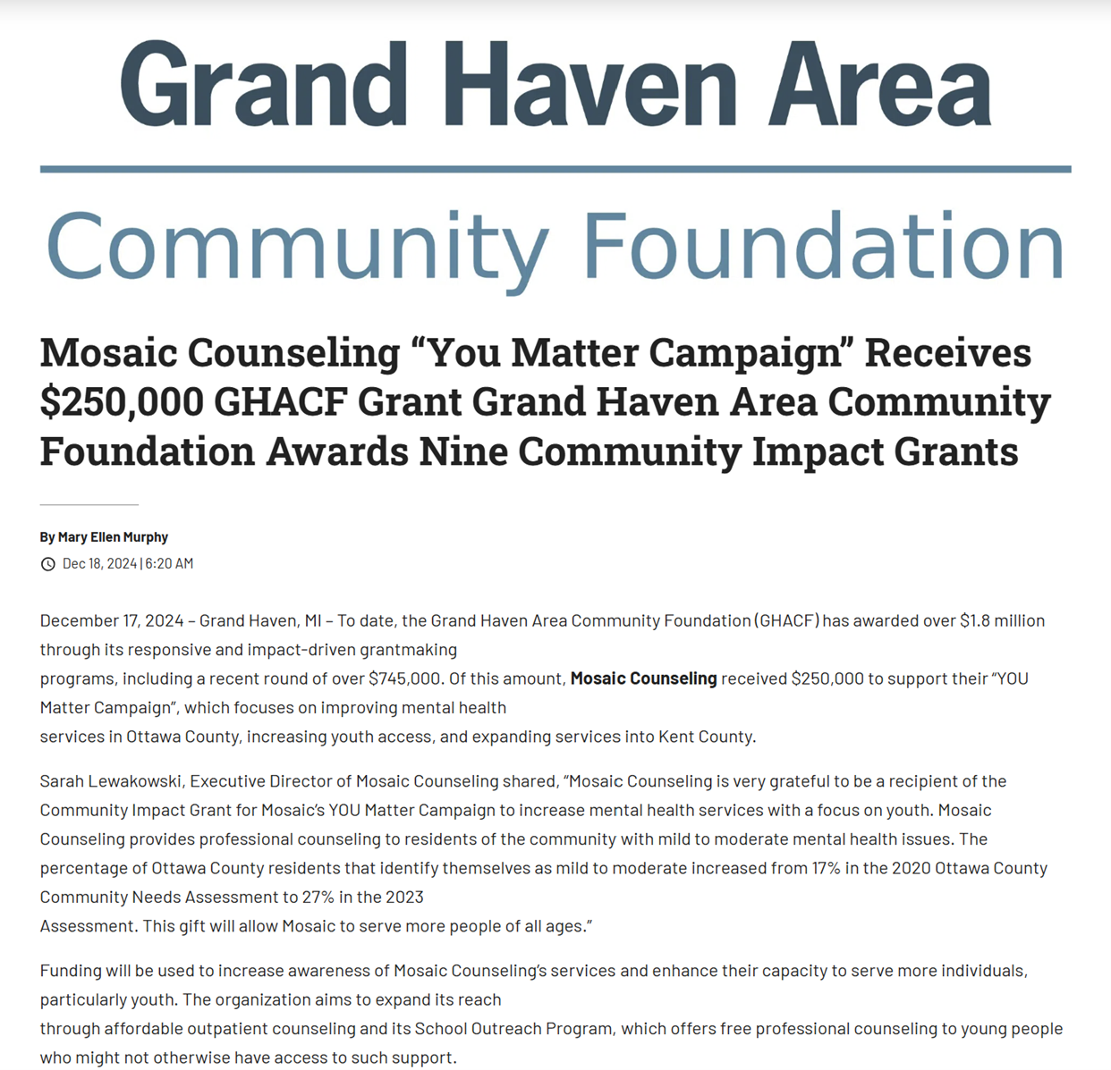 We are alsograteful to Grand Haven Community Area for a grant. A $250,000 CommunityImpact Grant supported Goodwill’s “Cellulose Creation from Waste Textiles” project, specifically noting the collaboration with Harvest Nano.
